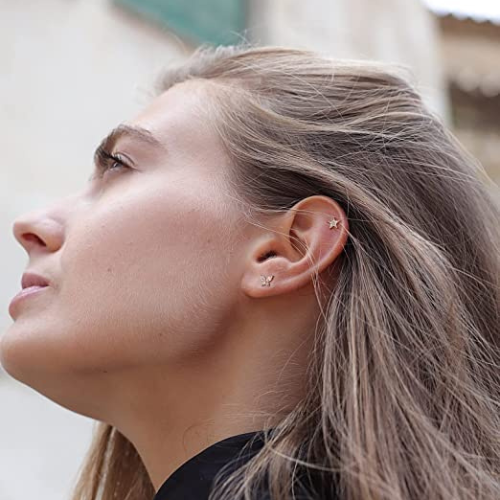 Wear a beautiful earring set to make your ears look better. 14K gold plated earrings for women consisting of butterfly studs and small earrings and star studs. All three earrings are set with sparkling zirconia stones and are perfect for wearing alone or stacked.